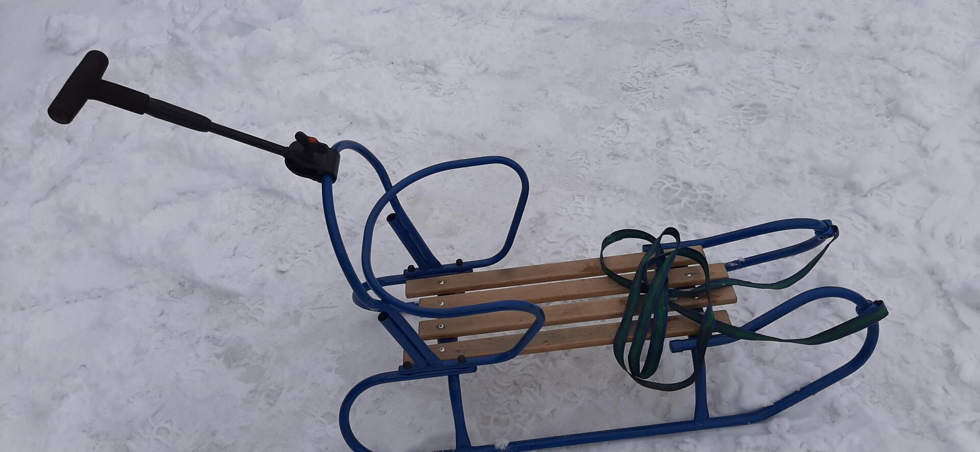 Jest nareszcie prawdziwa zima więc mam prawie nowe metalowe sanki które to posiadają odpinane oparcie oraz zamontowany jest też pchacz który to pomaga w sterowaniu sankami będąc z tyłu pociechy siedzącej przed nami , więc dziecku nie będziemy przeszkadzali w podziwianiu zimowej aury z przodu , jest również taśma do ciągnięcia sanek